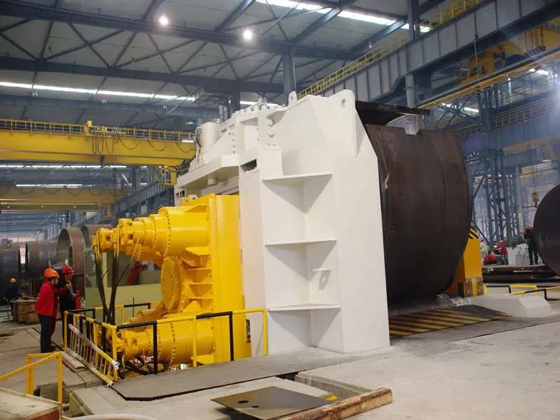 液壓全驅(qū)動(dòng)水平下調(diào)式三輥卷板機(jī),釆用右主油缸釆用上置,左主油紅下置式結(jié)構(gòu)。該機(jī)三個(gè)工作棍均為主驅(qū)動(dòng)輥,上輥由液壓馬達(dá)通過(guò)行星減速 機(jī)減速帶動(dòng)回轉(zhuǎn),下輥由液壓馬達(dá)通過(guò)行星減速機(jī)減速帶動(dòng)回轉(zhuǎn),行星驅(qū)動(dòng)裝置與卷輾軸直接耦合,可以大幅度減少負(fù)載損失(無(wú)用功),使盡可能 大的功(有用功)用于卷板;上掘的升降采用液壓傳動(dòng),升降位移由計(jì)算機(jī)控制,自動(dòng)調(diào)平,屏幕顯示,同步精度±0.2mm。下輥水平移動(dòng)采用機(jī)械 傳動(dòng),水平移動(dòng)通過(guò)蝸輪減速機(jī)減速,經(jīng)螺桿、螺母副轉(zhuǎn)換為直線運(yùn)動(dòng)帶動(dòng)。翻倒架的傾倒和復(fù)位采用液壓傳動(dòng)上的尾部裝有液壓平衡機(jī)構(gòu),可以方便卸出卷制后的工件及筒體。設(shè)有固定式操作臺(tái)和遙控按鈕盒各一個(gè),方便工人使用。設(shè)有安全聯(lián)鎖裝置,使操作更加安全。該機(jī)操作簡(jiǎn)單、維 修方便,卷制精度高,是一種先進(jìn)實(shí)用的大型卷板設(shè)備。