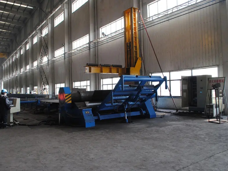 5. 四輥卷板機(jī)預(yù)彎曲:將前后輥調(diào)整到工作所需的相應(yīng)位置,并啟動(dòng)上輥進(jìn)行成型和彎曲。